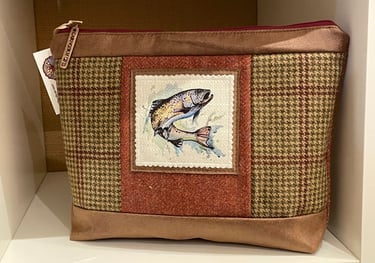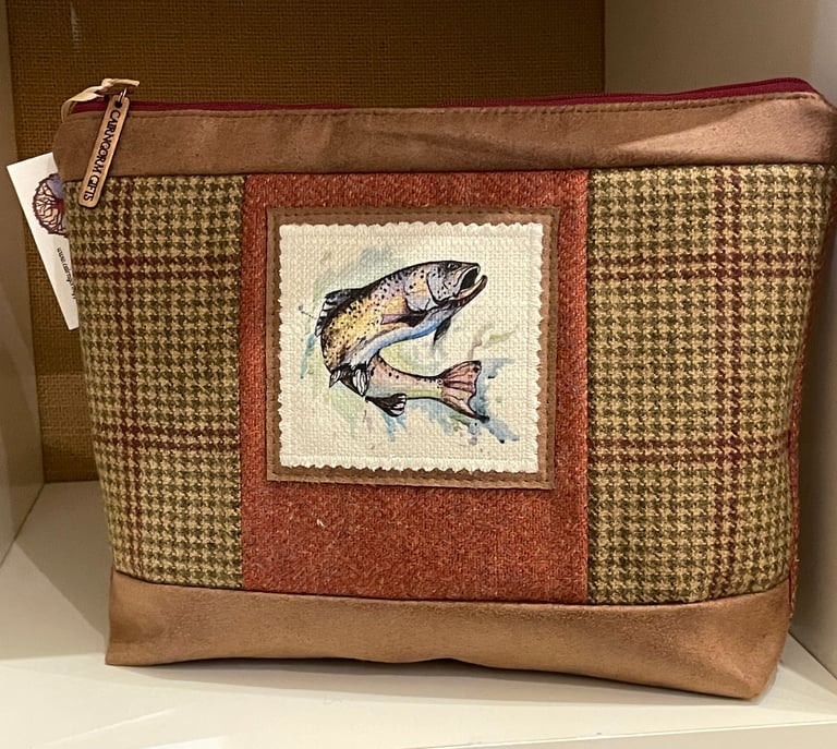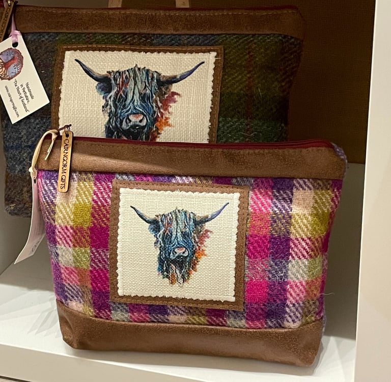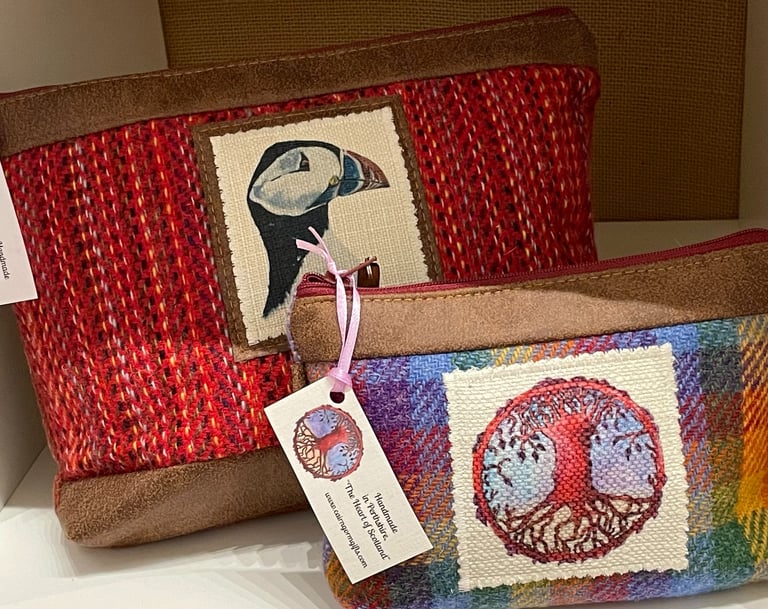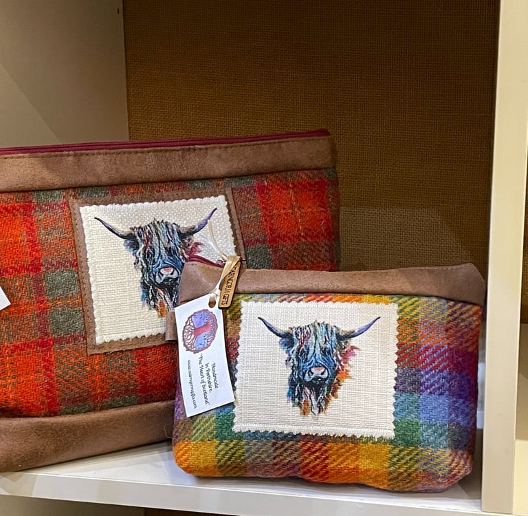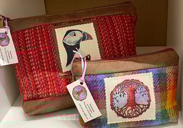 Various sizes of handmade tweed bags are available and have many uses from cosmetic bags, to wash bags and purses.prices range from £19.00 for a small purse to £45.00 for a large wash bag,(excl post and packaging).All bags are lined with a handmade wooden zip tag. The leather like finish is faux. Message for availability and styles