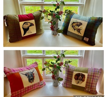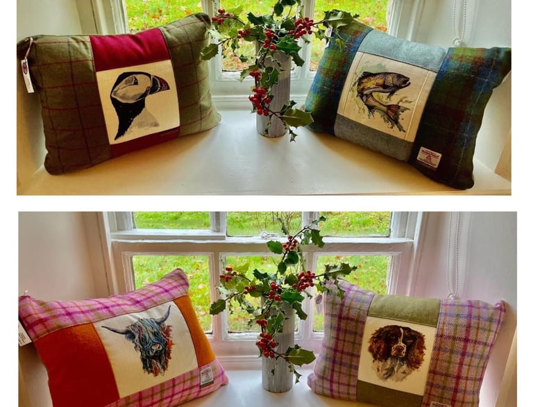 Handmade Harris tweed cushions in various sizes.Featuring unique Scottish themed artwork Prices start from £42.00, (excl post and packaging).Please message for more information and style availability.